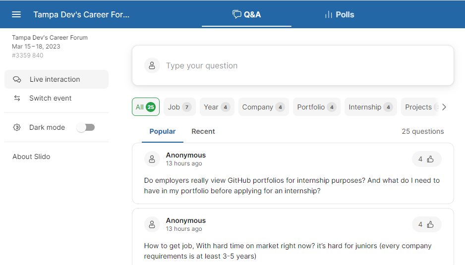 Thank you to everyone who attended our first annual career forum! We had over 80 of you guys show up and 25 questions asked on the anonymous slido questions!